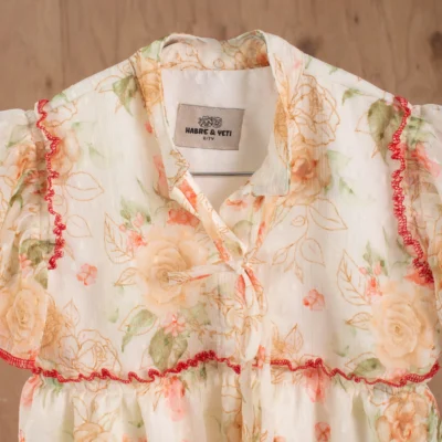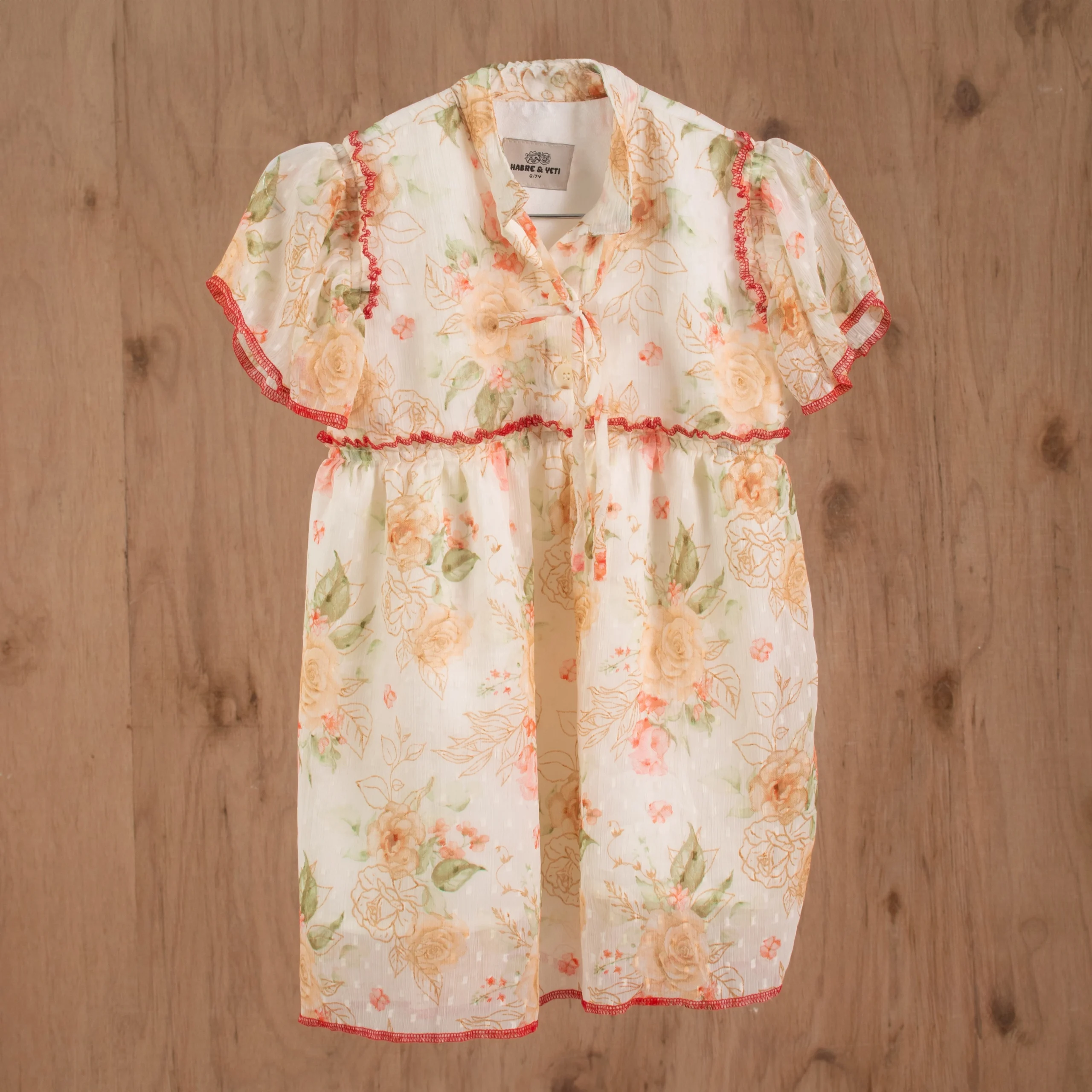 This whimsical chiffon dress is a fluttery delight for your little one. With its oversized silhouette and dreamy floral print, it features delicate gathers and overlocked frill trims at the waist and sleeves. The half sleeves flow gently with matching frilled charm, while the enclosed neckline has a dainty stand collar and a tie-up string, paired with a cute button-down front.