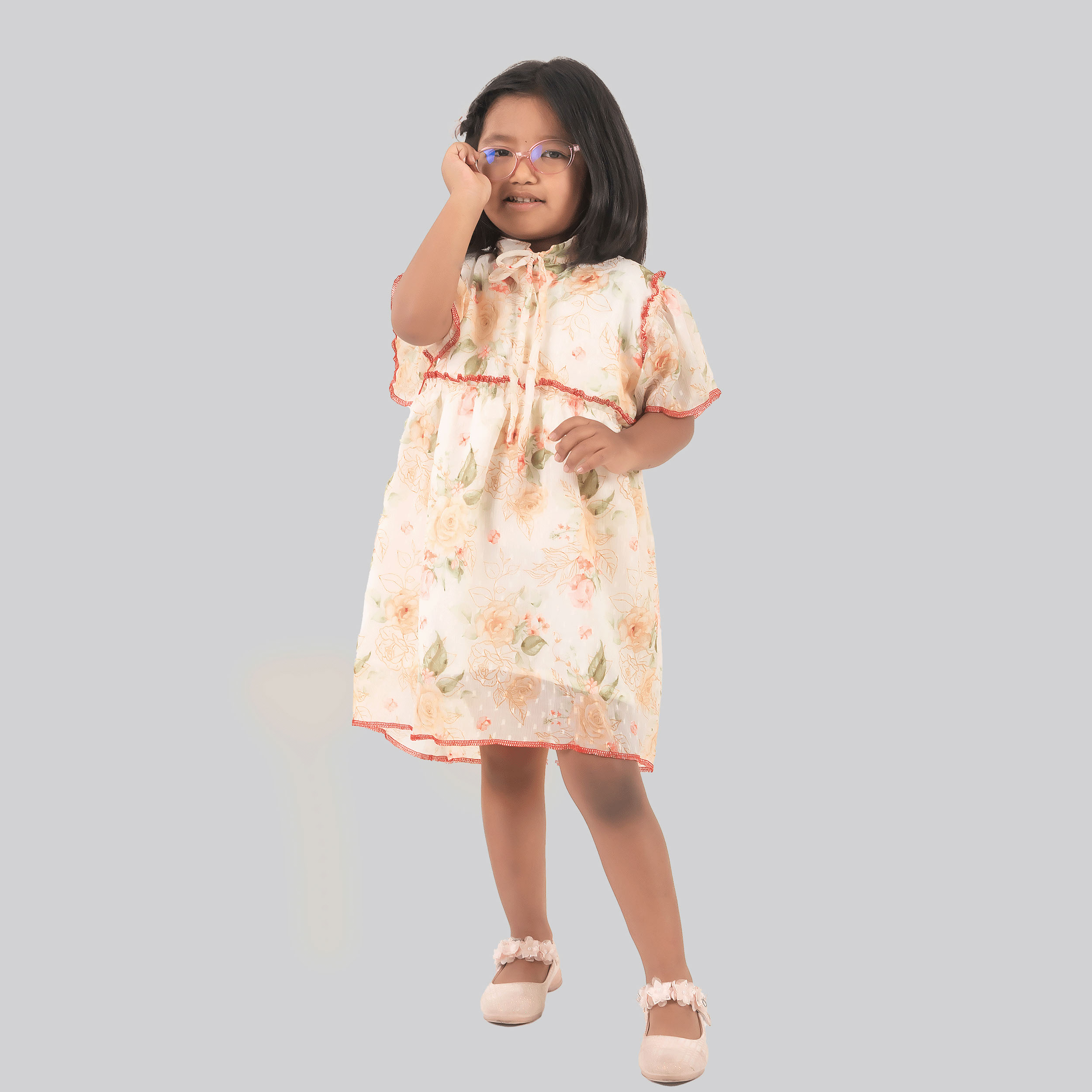 This whimsical chiffon dress is a fluttery delight for your little one. With its oversized silhouette and dreamy floral print, it features delicate gathers and overlocked frill trims at the waist and sleeves. The half sleeves flow gently with matching frilled charm, while the enclosed neckline has a dainty stand collar and a tie-up string, paired with a cute button-down front. The flared skirt adds a touch of twirl-worthy fun, making it just right for garden parties, playdates, or any day that calls for a little magic.