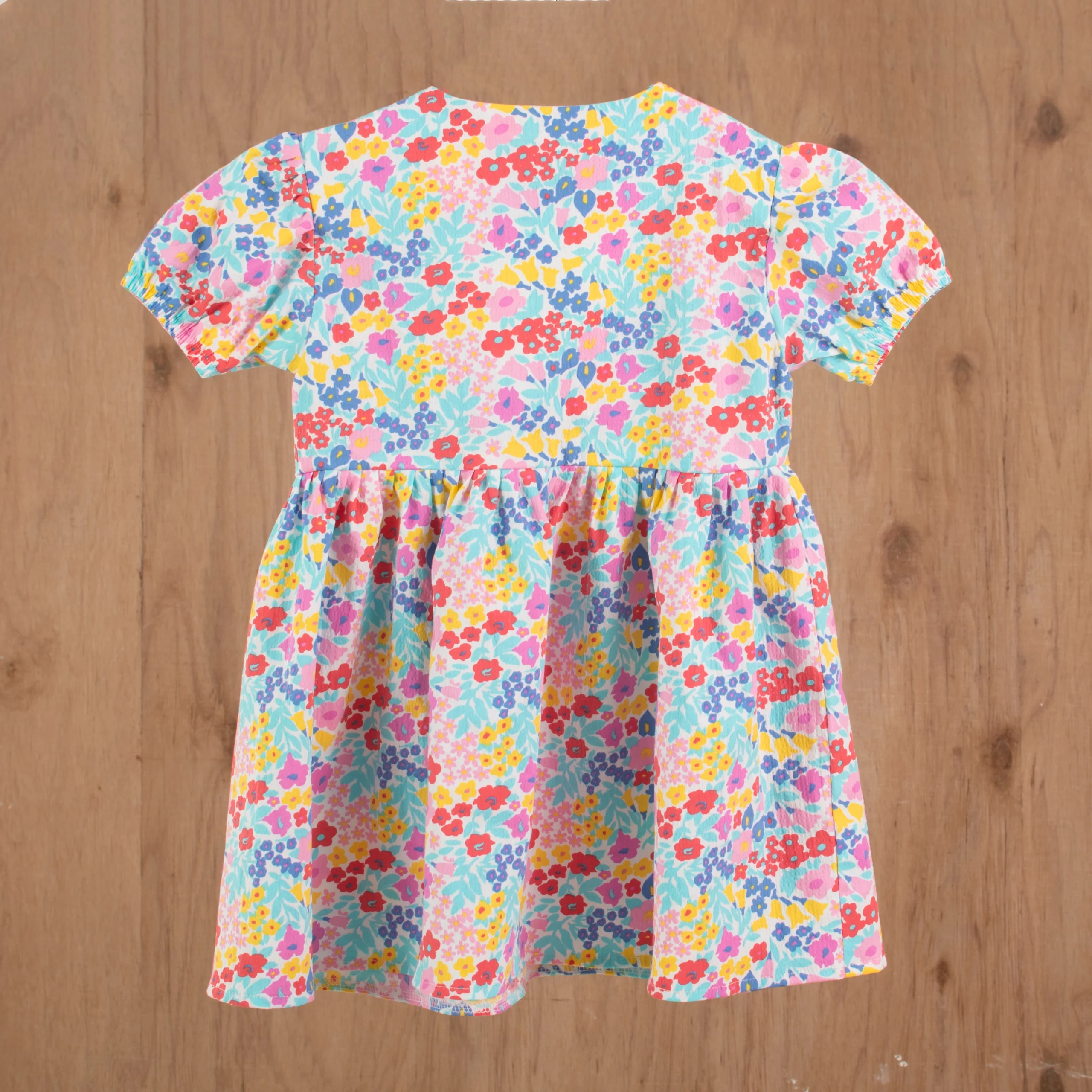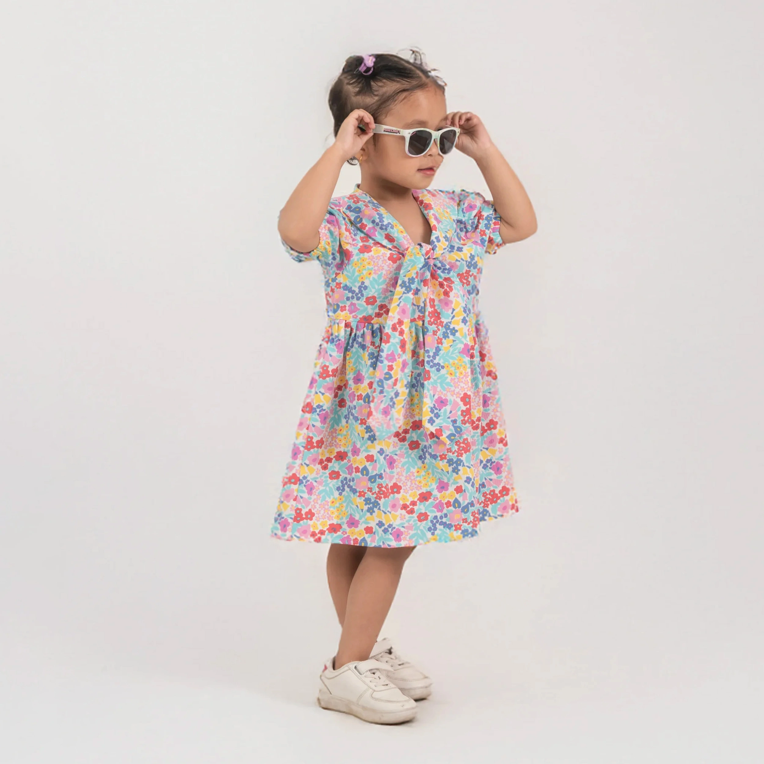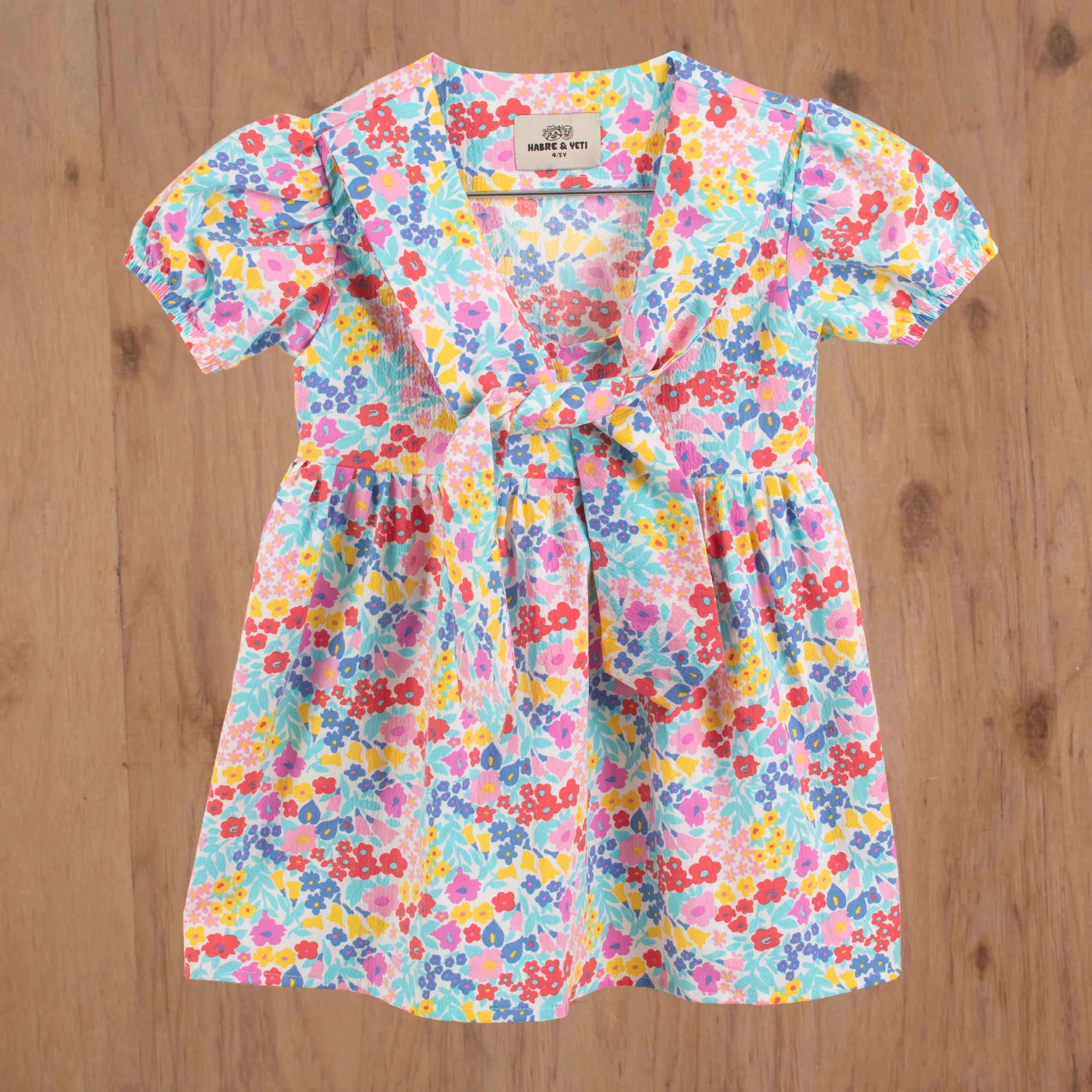 A twirl-worthy favorite! This adorable multicolor dress features a wide shawl collar that turns into a sweet little tieālike a bow just waiting to be noticed!Ā Short puff sleeves add the charm, while the stretchy gathered waist keeps it comfy for all-day play and giggles. Perfect for tea parties, twirls, and everything in between!